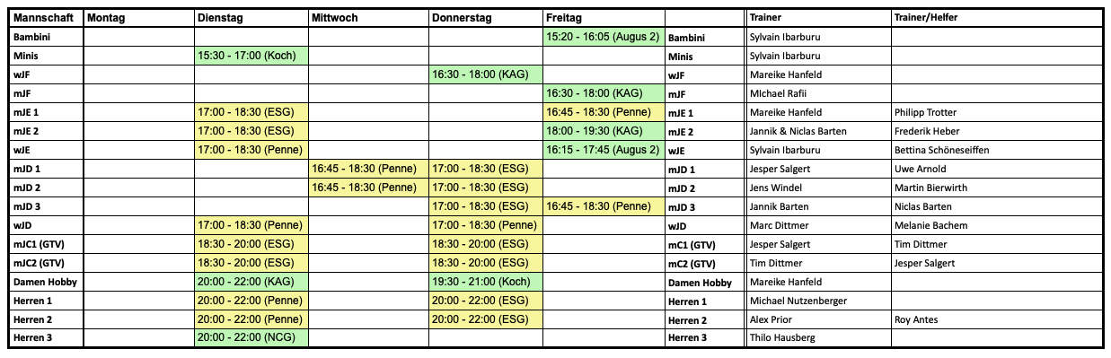 Trainingszeiten in der Übersicht